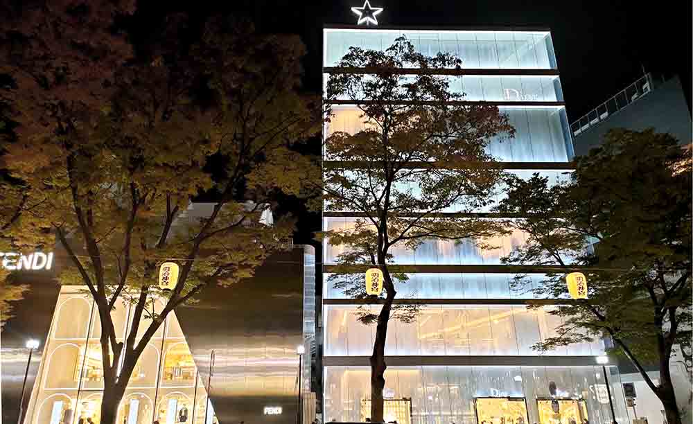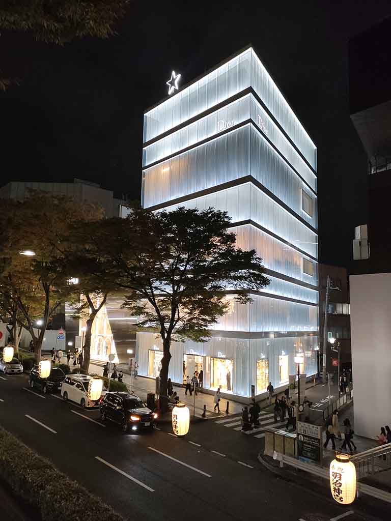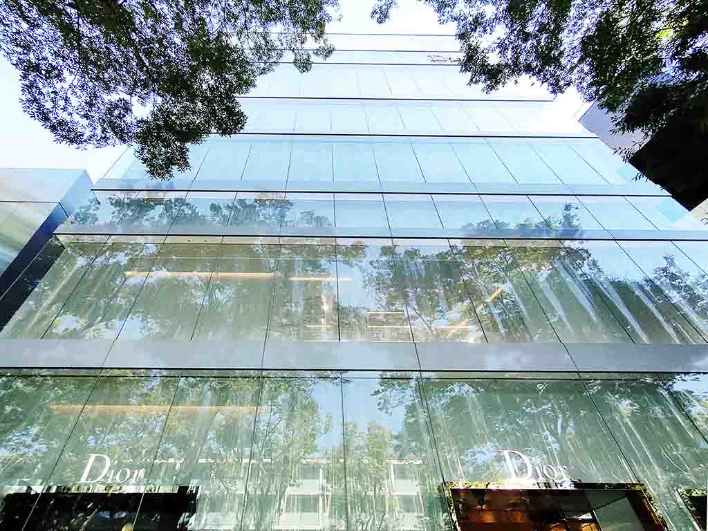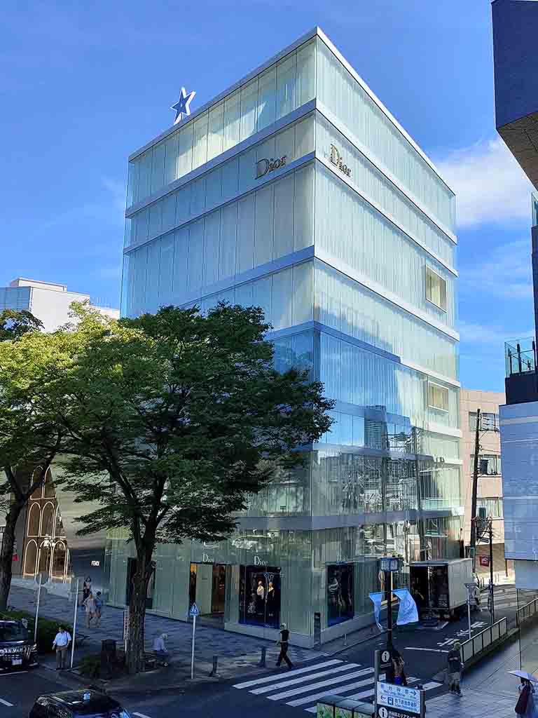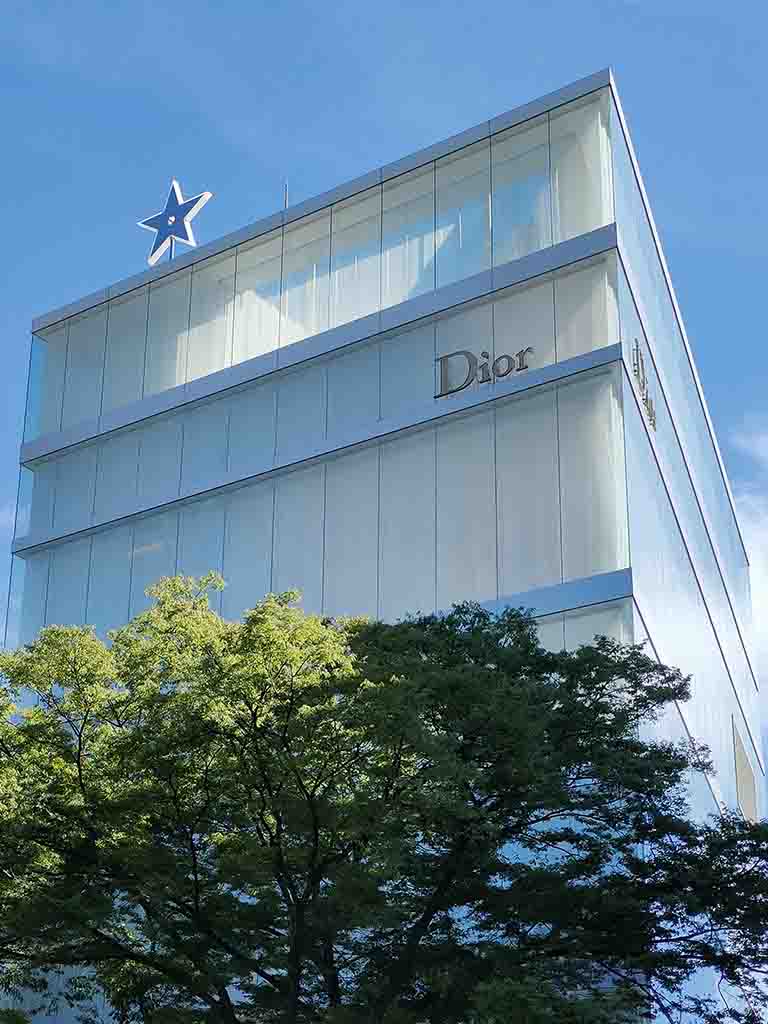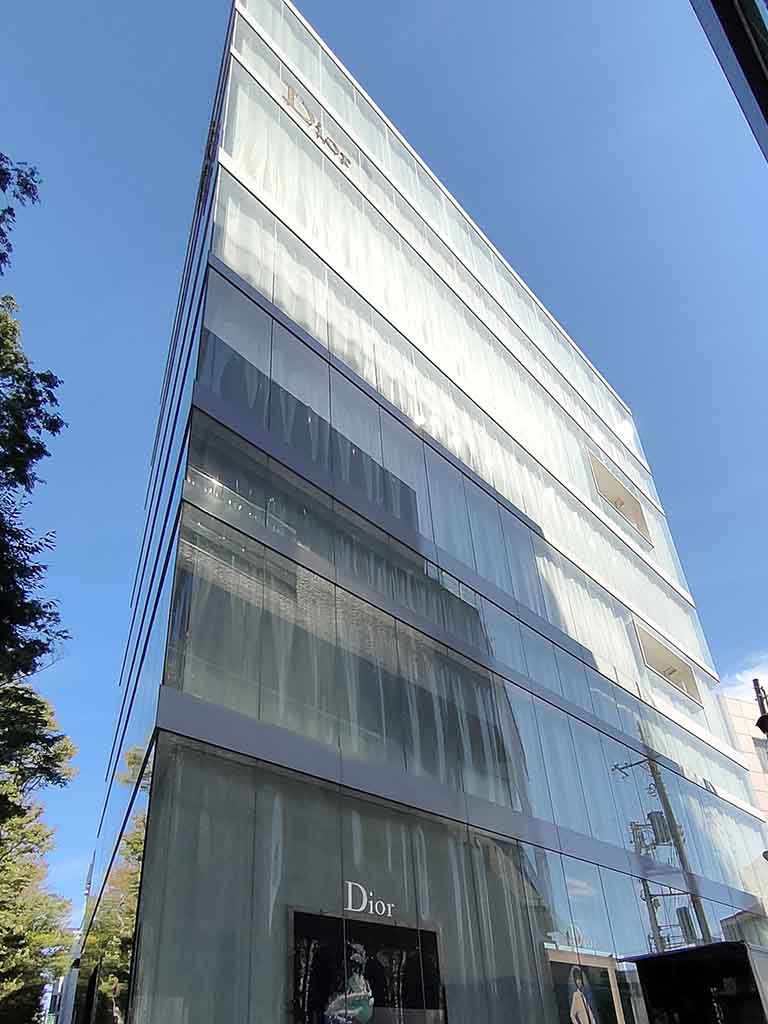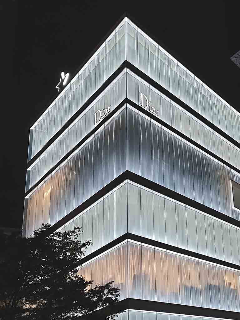 Nishizawa: The basic structure is simple. As the floors have no partitions, it’s vertical layers of boxes. The original request was to design a 30 meters high building with four floors. But we thought the ceiling heights would be too high with only four floors. So we inserted an attic for each floor, which had different heights. The walls are double-pane with glass and acrylic panels. We wanted to make the walls transparent so that the entire building was open toward the outer environment. It was also in response to the request from Christian Dior: they wanted us to incorporate design details that represent Dior-ism.