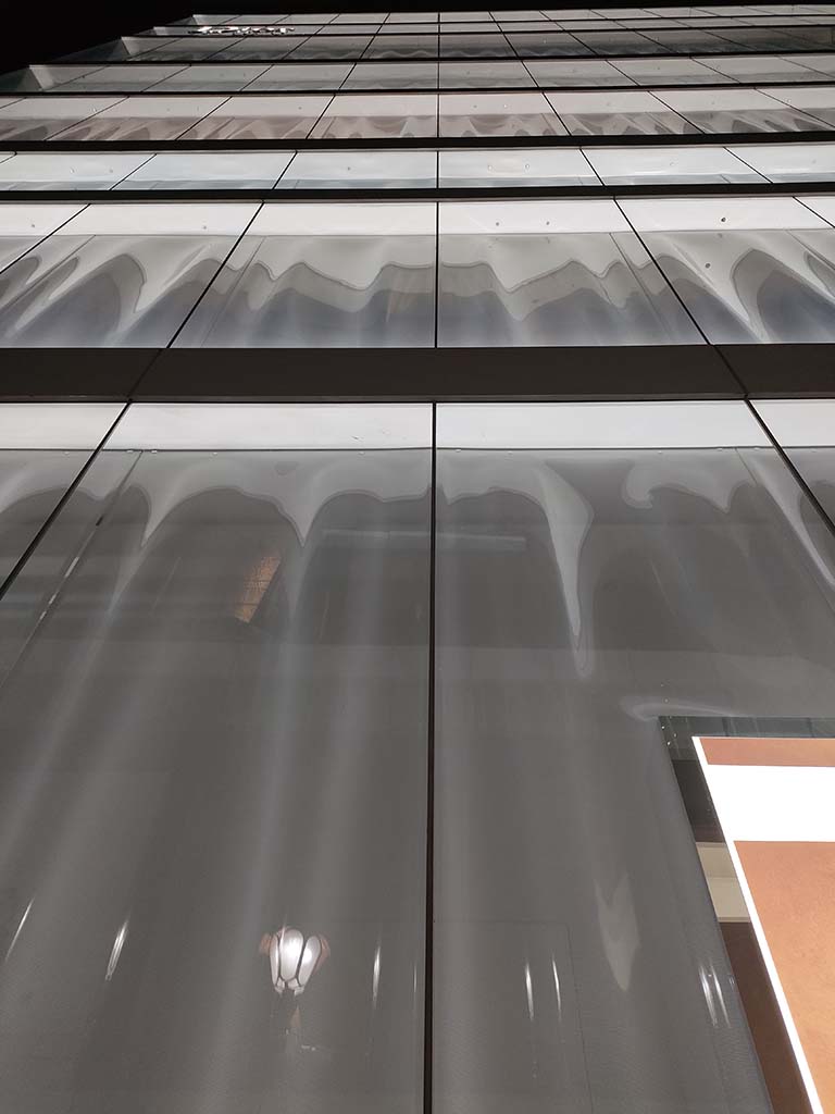Sejima: In order to achieve it, we are using lighting from outside as well. Lights from both inside and outside are reflected on the acrylic panels, and that’s why it looks like as if the entire building is emitting light.