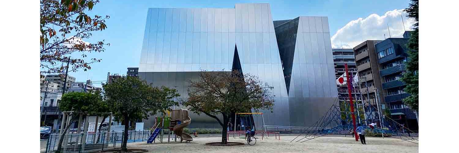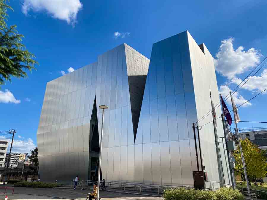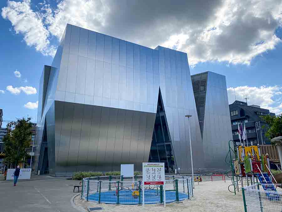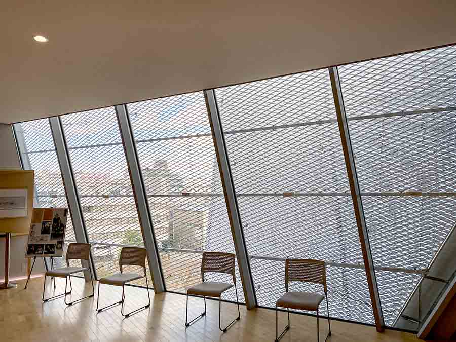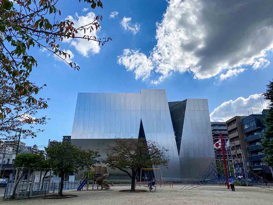 The exterior is covered with aluminum sheets, which softly reflect the skies and the surroundings. With slanted walls, the reflections can be some of Hokusai’s works that applied multiple perspectives.