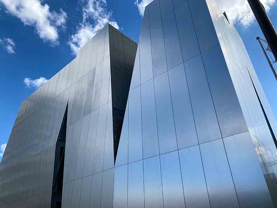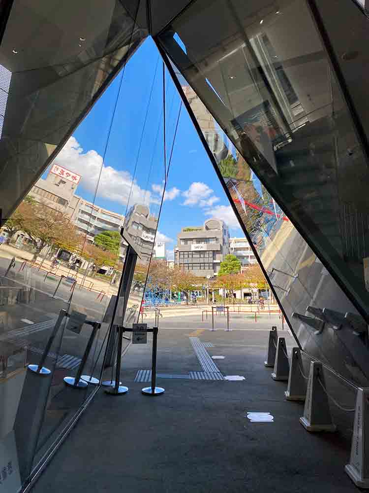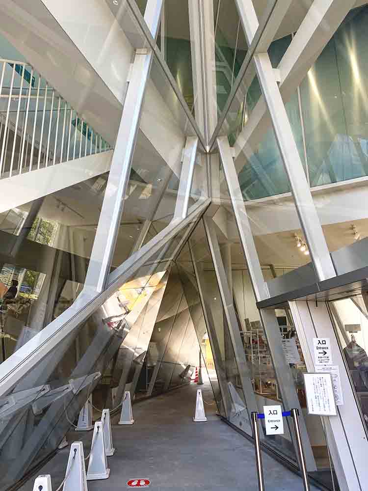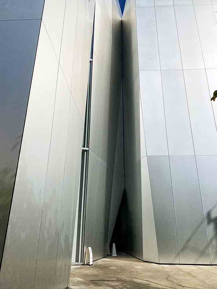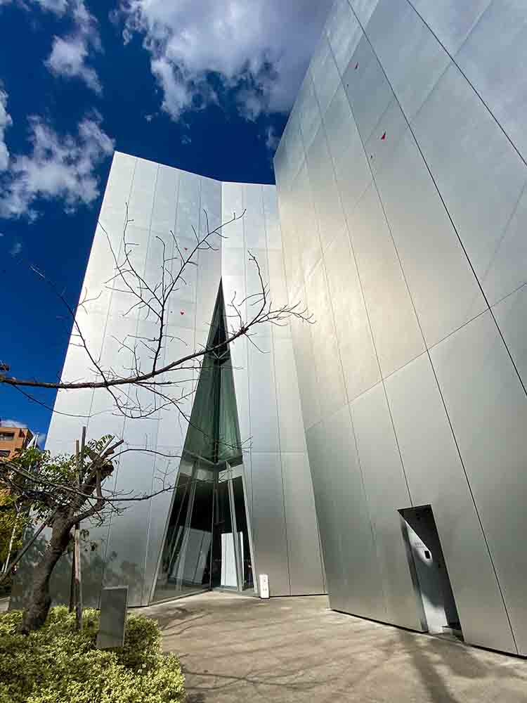 The exterior is covered with aluminum sheets, which softly reflect the skies and the surroundings. With slanted walls, the reflections can be some of Hokusai’s works that applied multiple perspectives.