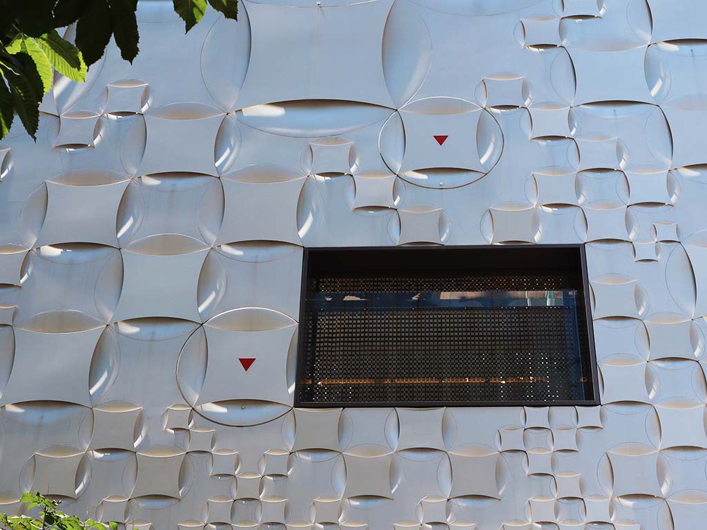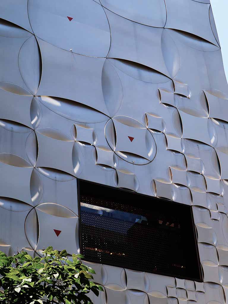 Aoki covered the exterior with opal/beige colored plates with elegant curves that came in different sizes. He called them the “soft D’Amier,” which combined Edo komon and D’Amier via Art Deco. During the day, the plants change their expressions reflecting the sunlight. At night, LED lights under the plates give the facade a different look that resembles the signature Monogram.