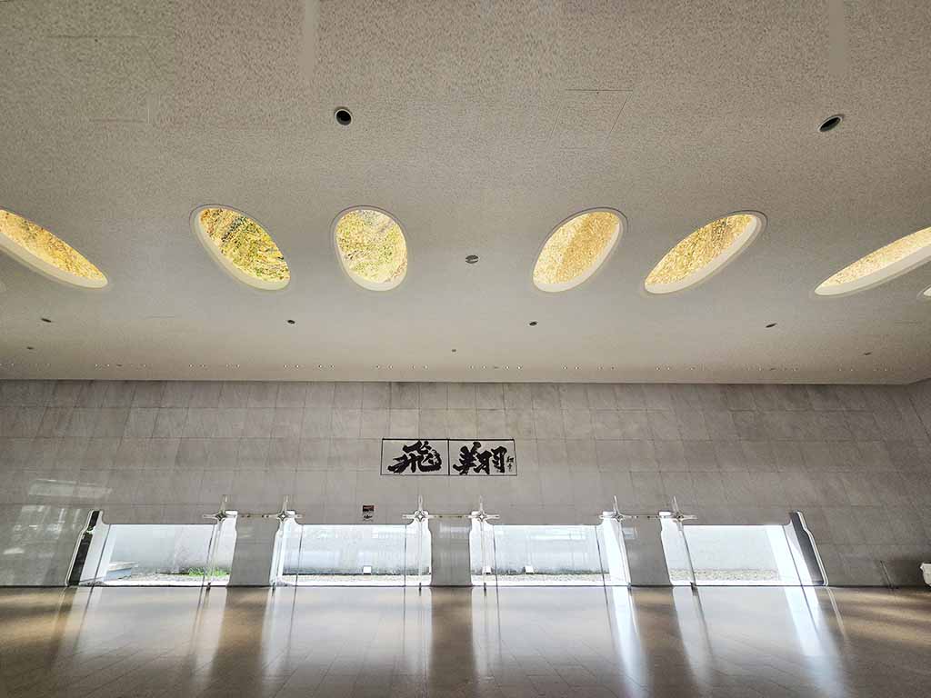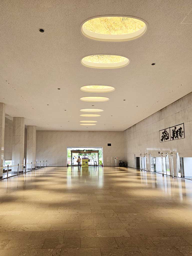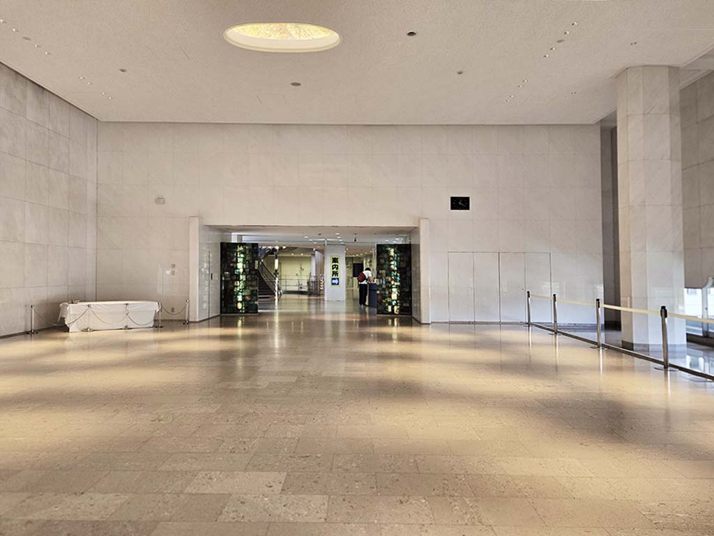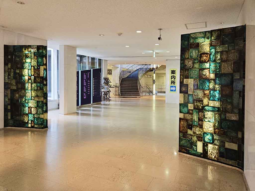 The ceilings have eight skylights with beautiful glass mosaic art by Tanpei Sakuno (1931-2000) that represented four seasons. Originally Murano wanted to rely only on the sunlight coming through windows at the bottom of the walls, skylights and minimum amount of electric lights to the entire entrance area. With a lot more subdued atmosphere, the effect of mosaic art and skylights must have been more stunning.