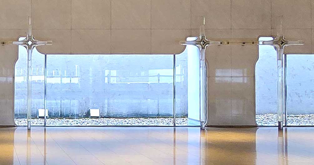 Windows are installed at the bottom of the walls. It is called 地窓 (jimado) in traditional Japanese architecture, and is used to enjoy restricted/ (controlled) view, typically traditional Japanese garden and subdued sunlight that comes through it. Cross-shaped acrylic objects are installed by the walls/windows on the West side, which originally had lights embedded in them. As Murano had unique ability to blend elements that belong to different styles, you can see traditional Japanese architectural details such as jimado and European elements such as marbles mixed together in harmony.