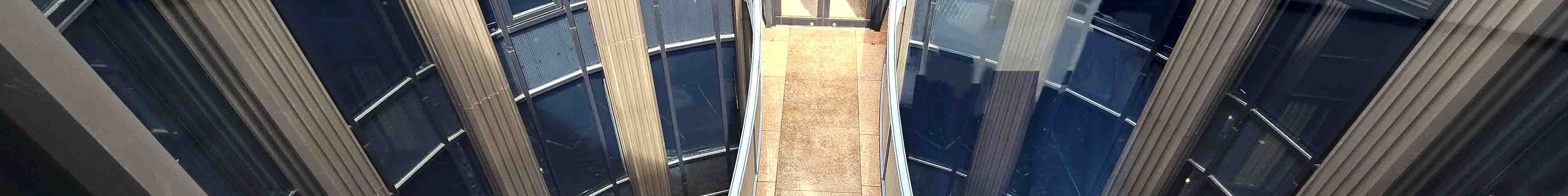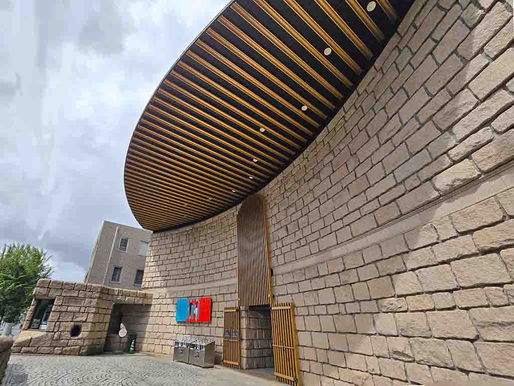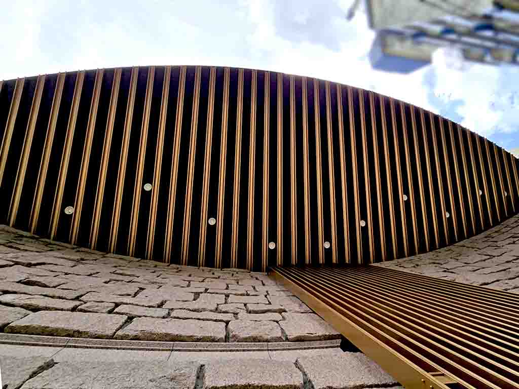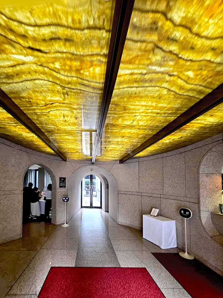 Once you enter the building, your eyes are caught by the bright yellow ceiling that uses onyx, which lets the sunlight come through.
