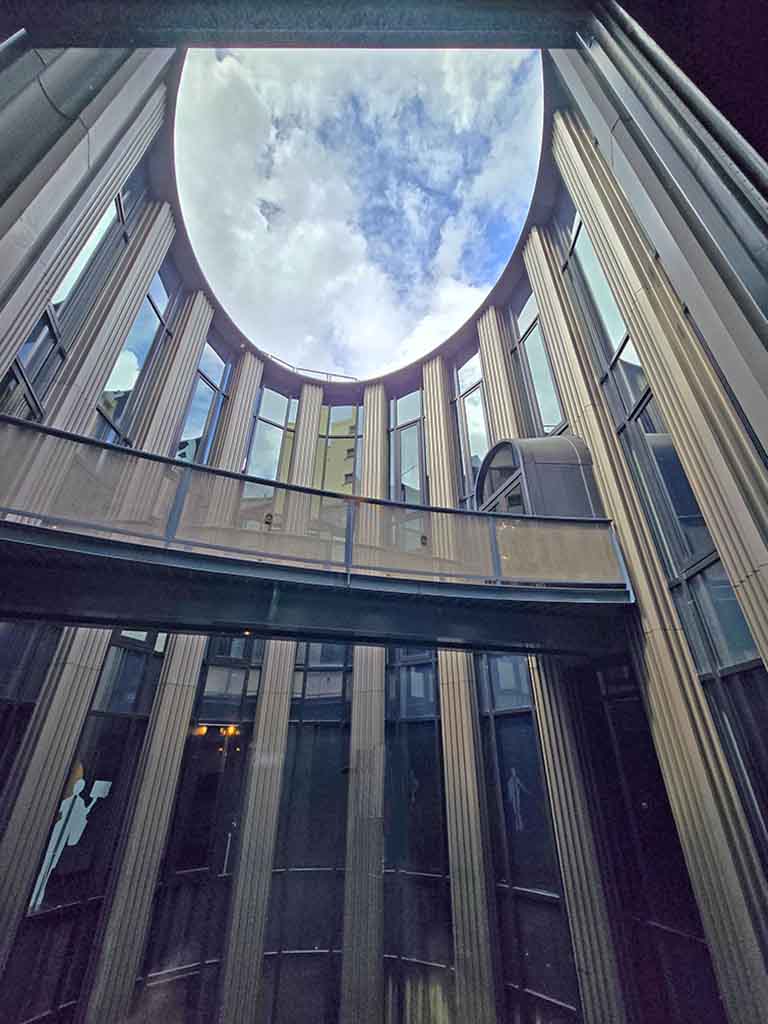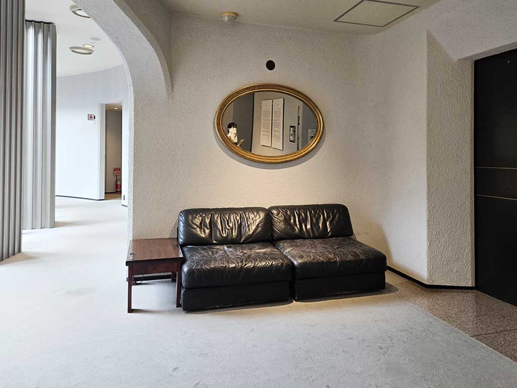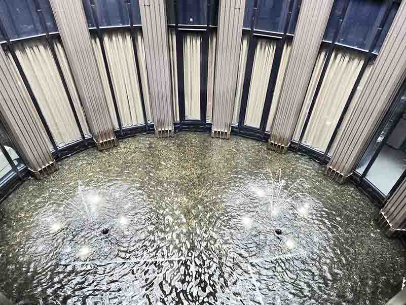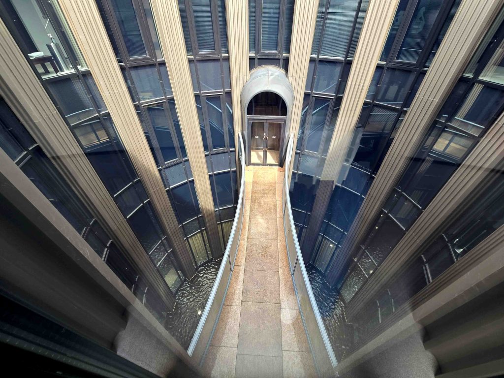 The facility has a unique shape with a circular fountain at the center. Exhibition rooms surround the fountain, and a skyway connects one side with the other (although it doesn’t look like it’s in use.) As the fountain area embraces natural elements (the sky and water), the building doesn’t feel as compact as it actually is. Circular and curvy lines are everywhere, which also helps the place look like a maze or more expansive.