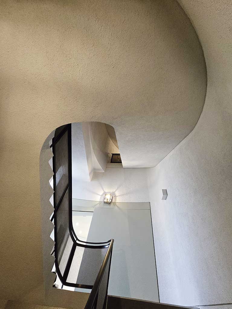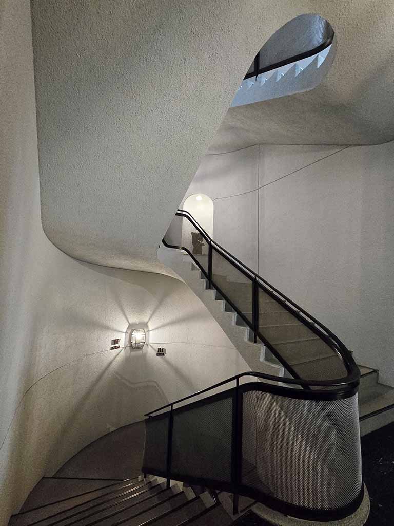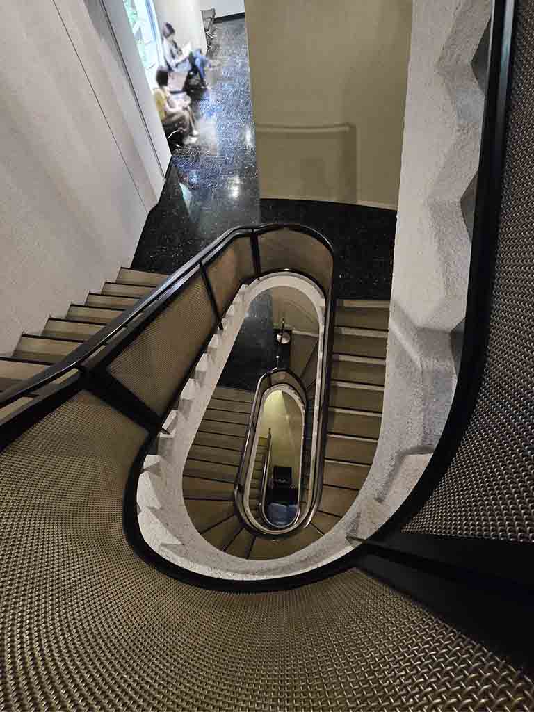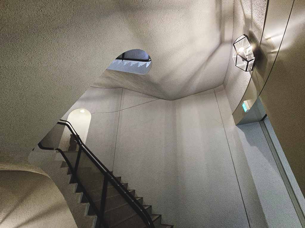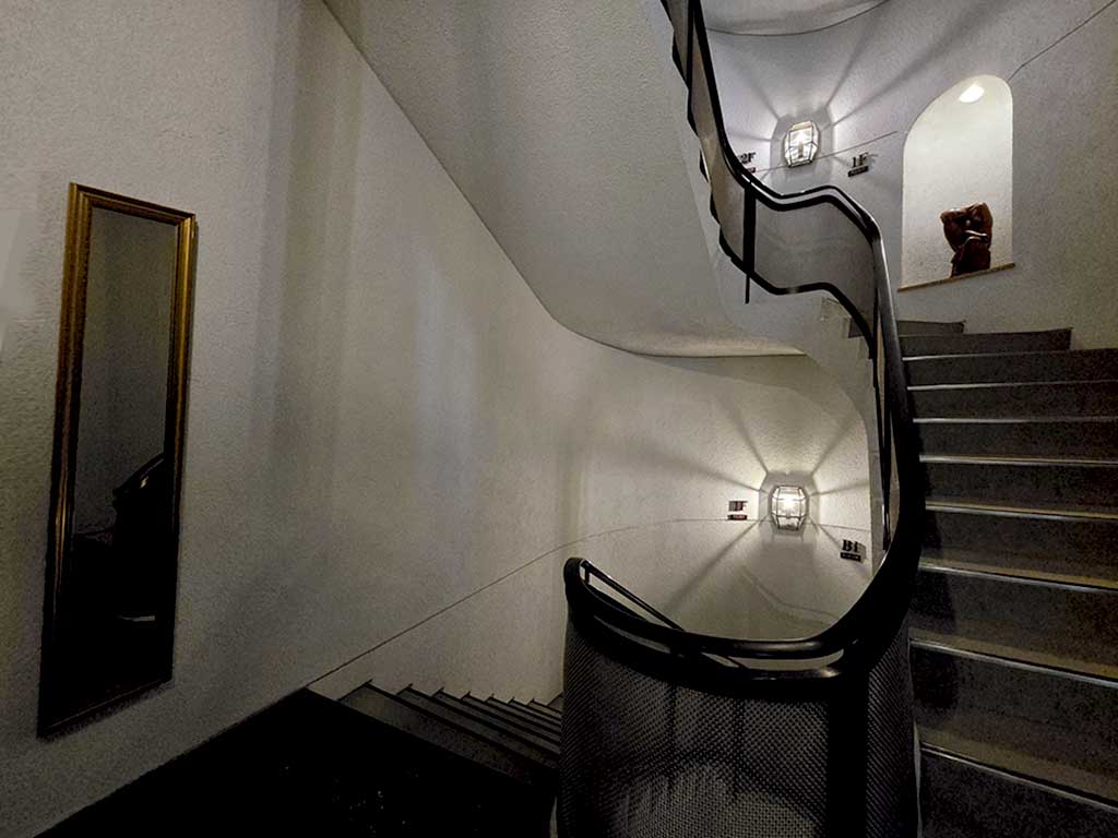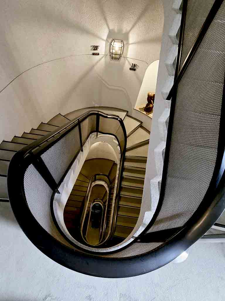 Beautiful staircases contribute to the mysterious atmosphere. To match his stye, Shirai also designed the lighting. (He designed it to be on a dimmer side for aesthetic effects, but today it is brighter to ensure safety.)