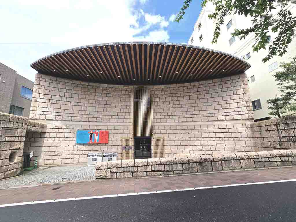 The museum is located in the posh residential neighborhood in Shoto, Shibuya. Because of the zoning requirements, the building had to be under 10 meters high. Shirai designed the facility to be only two-story and additional two stories underground. The exterior is finished with with special granite imported from Korea. It has a striking orange/pink-ish bright color. (Shirai named it “pink cloud stone.”)