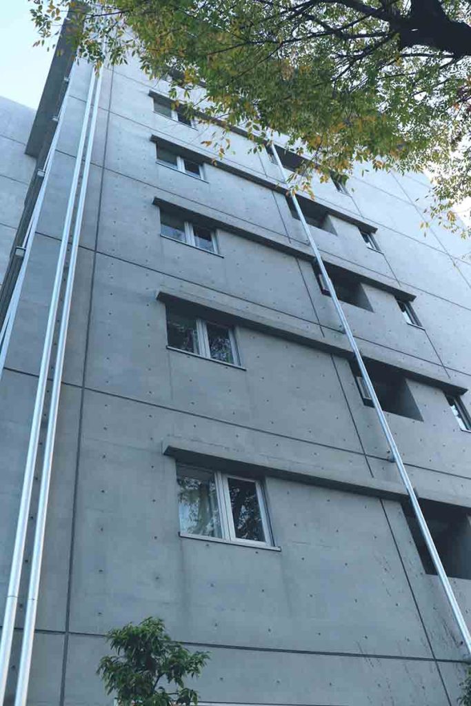 As this building sits on a very narrow lot, it’s really slim. It appears that it currently contains businesses such as a photo studio and a dental clinic. The main part of the building is covered with a glass wall, and next to it is a “wing” area made of flat concrete. It looks like a landmark or an object, rather than a building for practical use.